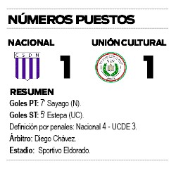Convirtieron para Nacional: N. Sayago, S. Gielow, C. Ovelar y V. Moreira. E. Flores desvió su remate. Para UCDE anotaron R. Maidana, R. Salinas y L. Estepa. Fallaron sus tiros E. González y M. Ríos.