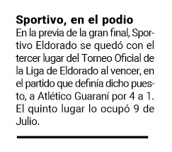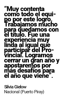 De golpear de entrada pasó a estar muy cerca de recibir el de nocaut, sin embargo el Club Social y Deportivo Nacional de Puerto Piray pudo soportar la embestida de Unión Cultural y Deportiva Eldorado y llegó a la definición por penales, donde se impuso por 4 a 3 y se alzó así con el título del primer Torneo Oficial de Primera División Femenino de la Liga de Fútbol de Eldorado.