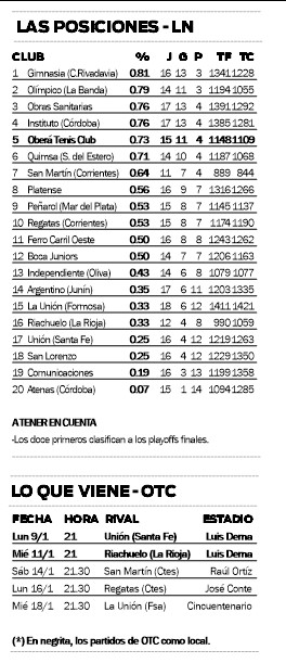 Lo cierto es que, tras el regreso como local para esos dos partidos, el Oberá Tenis Club regresará a la ruta para enfrentar a tres rivales, si se quiere, “directos” en las pretensiones celestes de volver a disputar los cuartos de final de la máxima categoría del básquetbol argentino.