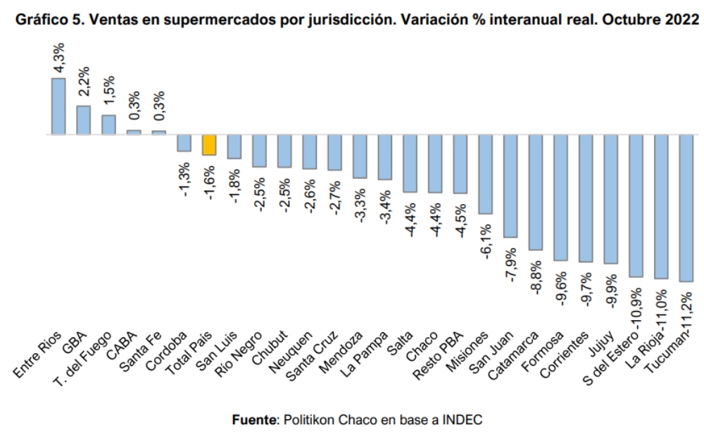 Sobre un total de 25 (la provincia de Buenos Aires se desagrega en Gran Buenos y resto de la provincia), sólo 5 exhibieron incrementos reales en sus ventas en supermercados durante este mes de análisis, es un escenario distinto al exhibido tres meses atrás -julio- cuando 22 habían registrado subas, evidenciando así un deterioro en el nivel consumo, fuertemente influenciado por el fenómeno inflacionario.