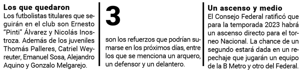 En referencia a la posibilidad del regreso del arquero Juan Mendonca, el dirigente aclaró que “con Juan cerramos el contrato de palabra, pero como tiene un acuerdo vigente con Güemes de Santiago del Estero hasta fines del 2023, estamos viendo la posibilidad de que pueda rescindir. Aunque esto se complicó, lo seguimos charlando. Si no es él, vamos a ir a buscar otro arquero”.