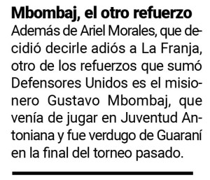 Causó sorpresa la partida del marcador central de Guaraní Antonio Franco, el correntino Ariel Morales, quien recibió una oferta del recién ascendido Defensores Unidos de Zárate, que en este año militará por primera vez en su historia en la Primera Nacional (ex Nacional B).