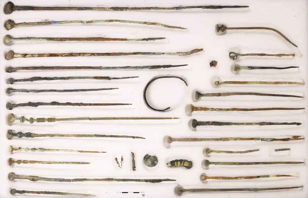 En la base del pozo, que alcanzó una profundidad de unos cinco metros, los arqueólogos encontraron alfileres de ropa de bronce, espirales de metal, un diente de animal colgante envuelto en metal y más de 70 vasijas de cerámica, entre otros elementos.