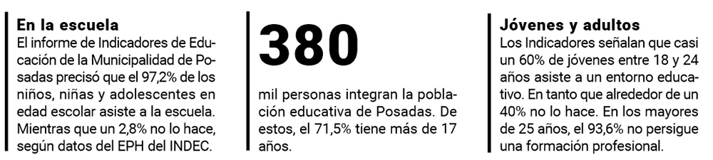 Los datos del informe señalan que la población escolar en Posadas está compuesta por un estimado de 380 mil personas. De estos, contabilizaron que el 71,5% tiene más de 17 años, el 24% entre 4 a 17 años y el 4,4% tiene entre 0 a 3 años.