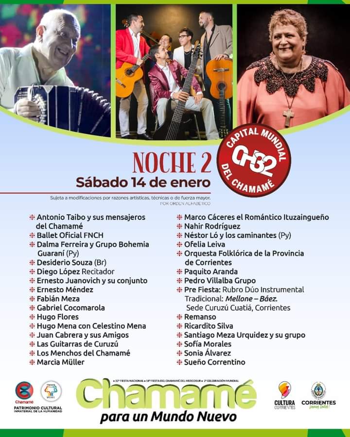 Mientras que para el sábado está prevista la presencia del misionero Fabián Meza, Ofelia Leiva, Los Menchos del Chamamé y Antonio Taibo y sus Mensajeros del Chamamé, entre otros.