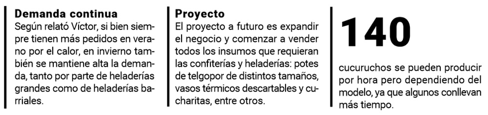 Depende de la heladería, algunas piden a Víctor 200 cucuruchos por día, otras 600 para toda la semana, e incluso pequeñas heladerías barriales que solicitan 100 o 50 cucuruchos para toda la semana.
