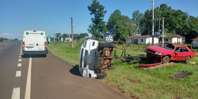 Una camioneta Chevrolet S-10 Pick Up, que trasladaba en un tráiler un automovil Renault Fuego, despistó y volcó esta tarde sobre la ruta nacional 12.