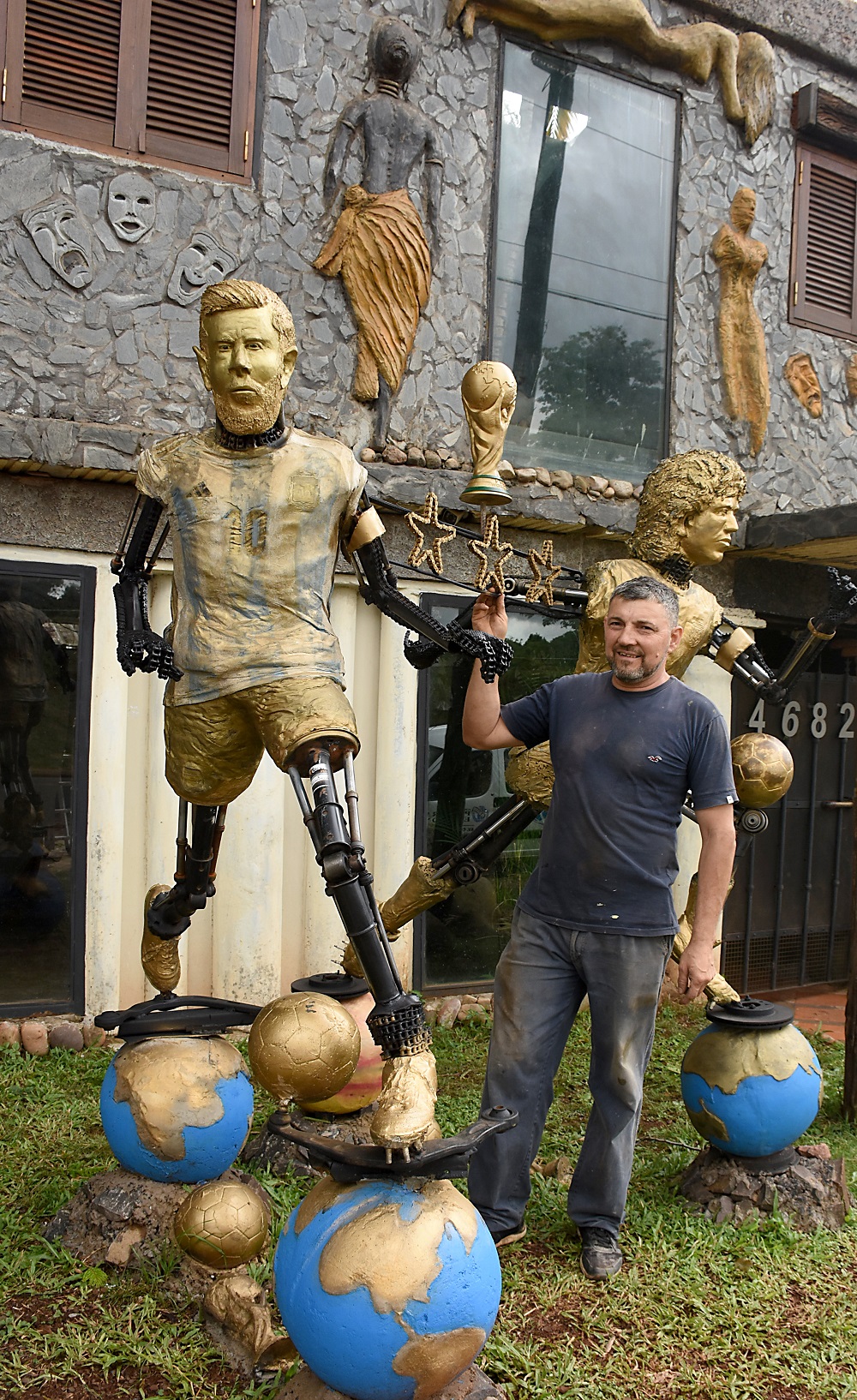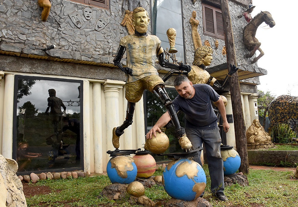 Desde su casa del barrio Regimiento, sobre la avenida Leandro N. Alem, de Posadas, y rodeado de sus obras, contó que a Diego Maradona lo había hecho después de su fallecimiento. “Lo hice como que está en el cielo, y como se está desintegrando la máquina a la que se le ven los huevos. Y quedaba hacer a Messi. Pero no sabía cómo. La idea inicial era montarlo sobre un plato volador, ratificando lo que dicen, que es de otro planeta, pero iba a perder mucho espacio y ya no me quedaba tiempo”, comentó, mientras entre sus manos sujetaba una cabeza del futbolista saliendo del cascarón de un extraterrestre.