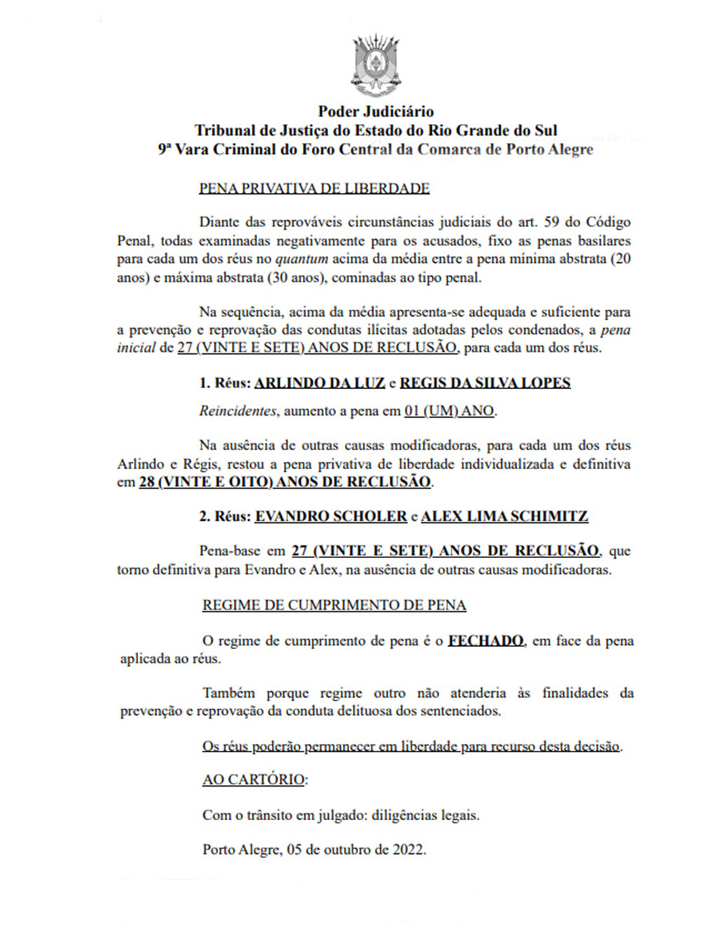 Tanto Da Luz como Da Silva Lopes recibieron 28 años de condena, mientras que Scholer y Lima Schmitz fueron sentenciados a 27 años. En base a la jurisprudencia de Brasil, los tres fueron autorizados a permanecer en libertad hasta tanto el fallo quede firme. Sin embargo, hasta ayer solo se encontraba en esa situación Lima Schmitz, ya que Scholer y Da Silva Lopes permanecen detenidos por otros delitos en la Penitenciaría de Máxima Seguridad de Charqueadas, a 50 kilómetros de Porto Alegre.