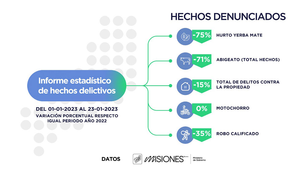 Los números cantan: de los robos de yerba mate que hubo hace un año, se bajó a un cuarto: de cuatro a uno. Y del abigeato (robo de ganado) se pasó de 21 a seis en el mismo período. Pero también hubo disminuciones en los robos calificados (es decir, tomar cosas ajenas con violencia o con fuerza causando daños en las personas, usando armas o en grupo en lugares con poca gente), ya que de 40 en 2022 se pasó a 26 en este año. Y lo mismo para los delitos contra la propiedad: de casi mil se bajó a 847 casos.