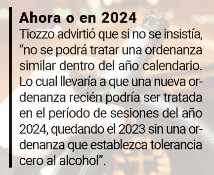 El edil opositor Sebastián Tiozzo explicó que la decisión de los concejales fue sostener la ordenanza original ya que, de acuerdo con lo establecido en la legislación nacional y provincial, “no se podrá tratar una ordenanza similar dentro del año calendario. Lo cual llevaría a que una nueva ordenanza recién podría ser tratada en el período de sesiones del año 2024, quedando el 2023 sin una ordenanza que establezca tolerancia cero al alcohol”.