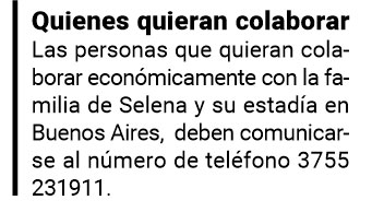 Allí comenzó una cruzada solidaria, a cargo de Marcela, la tía de Selena, en favor de los papás primerizos, ya que como trabajadores tabacaleros no cuentan con un ingreso mensual fijo. Y también ya que, desde que nació su hija, ellos solos se costearon la venida Posadas y la permanencia de la beba en un Sanatorio privado hasta que salió la derivación.