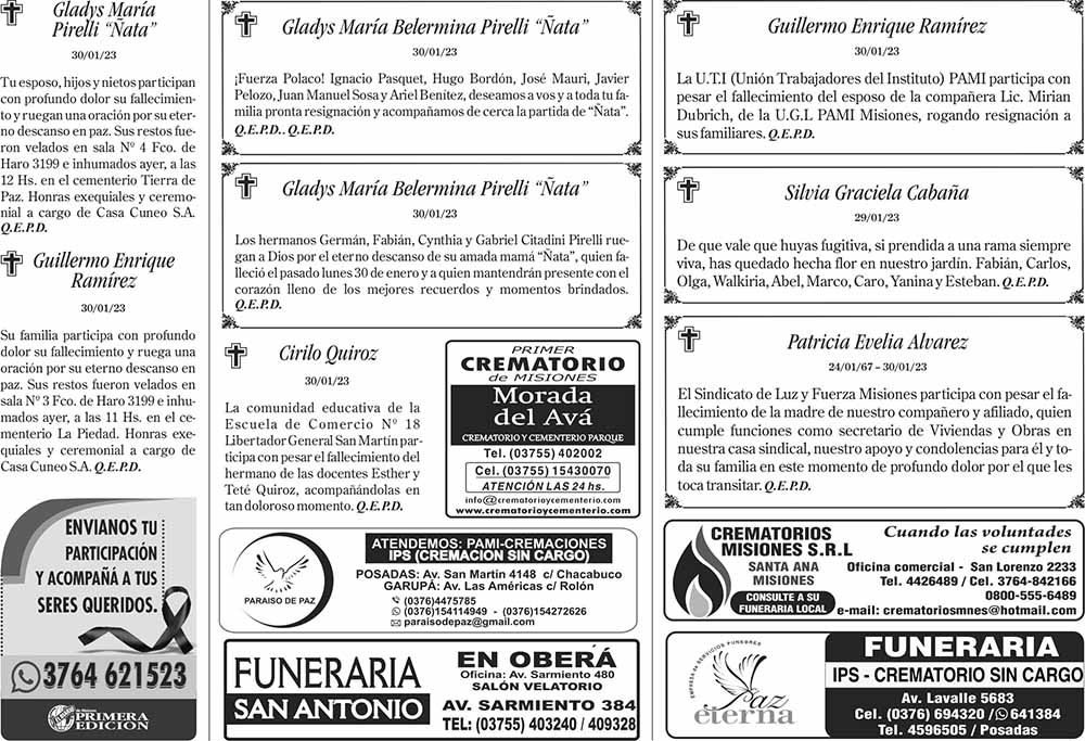 Fúnebres del Miércoles 1 de Febrero de 2023