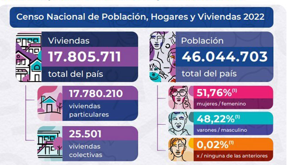 De acuerdo a este informe oficial, en Argentina la población mayoritaria es la femenina, con el 51,76%, frente a un 48,22% de varones y menos de 1% no identificado con ningún género. Cabe recordar que en esta ocasión una de las novedades del censo fue la posibilidad de no consignar a la persona ni como hombre ni como mujer. No obstante, los primeros datos muestran que pocos argentinos eligieron esa opción.