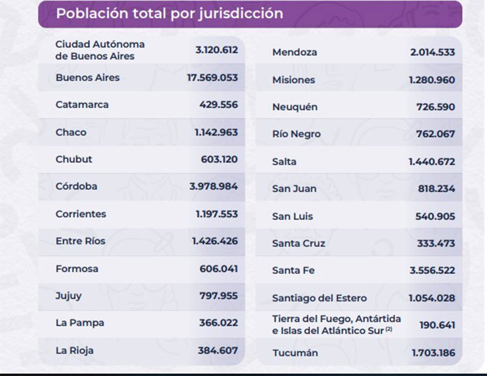 Por otra parte, las demás zonas con más población del país son Córdoba (3.978.984), Santa Fe (3.556.522), Ciudad de Buenos Aires (3.120.612), Mendoza (2.014.533), Tucumán (1.703.186), Entre Ríos (1.426.426), Salta (1.440.672) y Misiones (1.280.960).