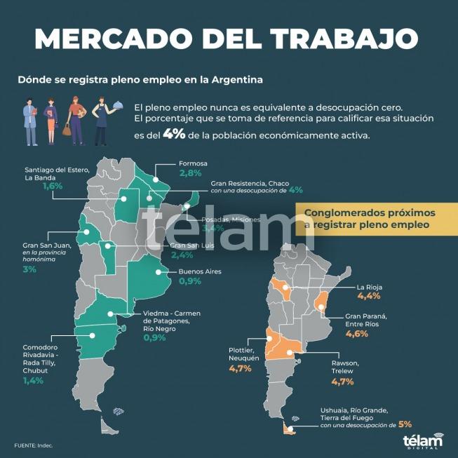 Además, hay otros cinco aglomerados con cifras próximas al “pleno empleo”: Ushuaia-Río Grande, Neuquén-Plottier, Rawson-Trelew, Gran Paraná y La Rioja.
