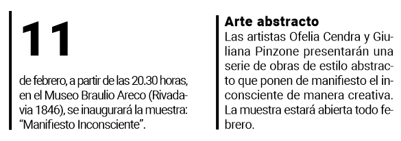 Las artistas Ofelia Cendra y Giuliana Pinzone presentarán el próximo sábado 11 de febrero, a las 20.30 horas, la muestra “Manifiesto Inconsciente” en la sala del Museo Municipal Lucas Braulio Areco (Rivadavia 1846) de la capital provincial. Una exposición de arte visual cargada con el color, la profundidad y la energía artística que caracterizan a estas mujeres.