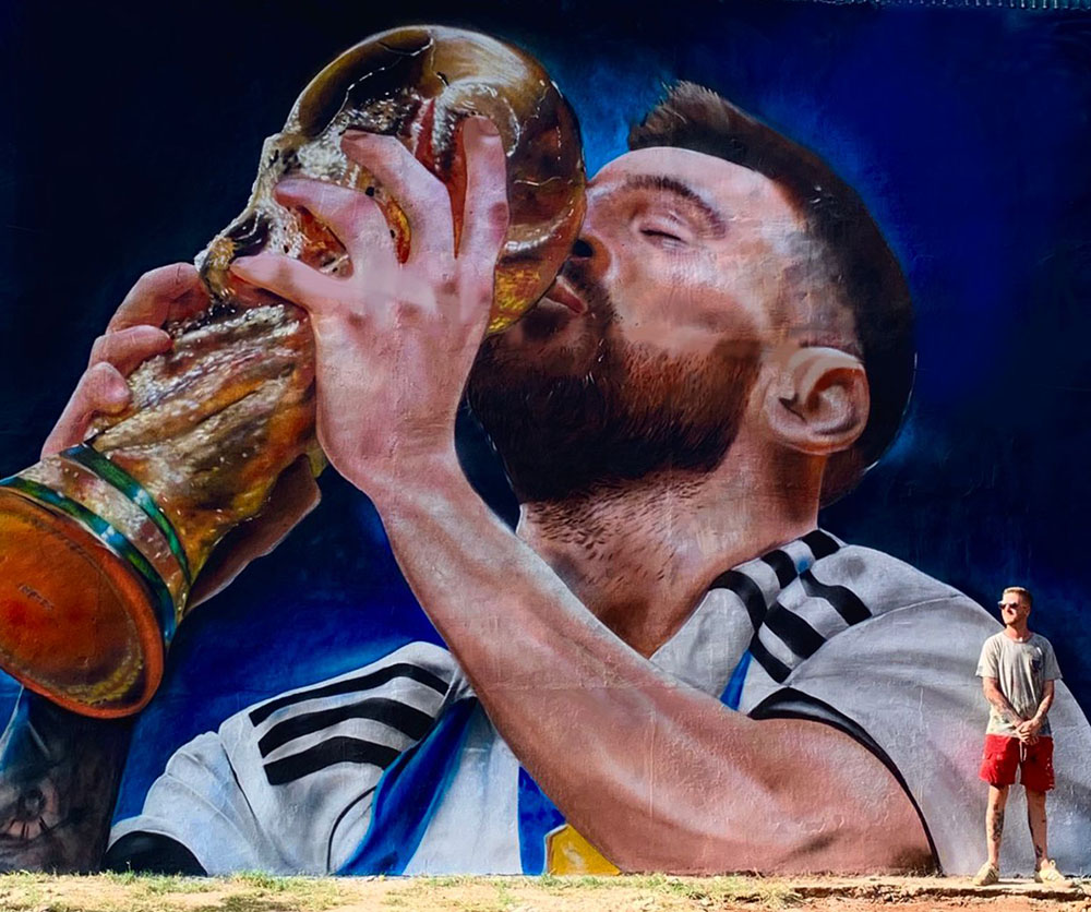 Luego de la consagración en el Mundial de Qatar 2022 los argentinos comenzaron a rendir homenaje a los jugadores de la Selección argentina en todo el país, especialmente a Lionel Messi. Fue con esa idea de sumarse a los festejos que un grupo de jóvenes de Puerto Esperanza, encabezados por Florencia Gruber, inició una campaña para plasmar la imagen del mejor jugador del mundo en un mural de su ciudad.