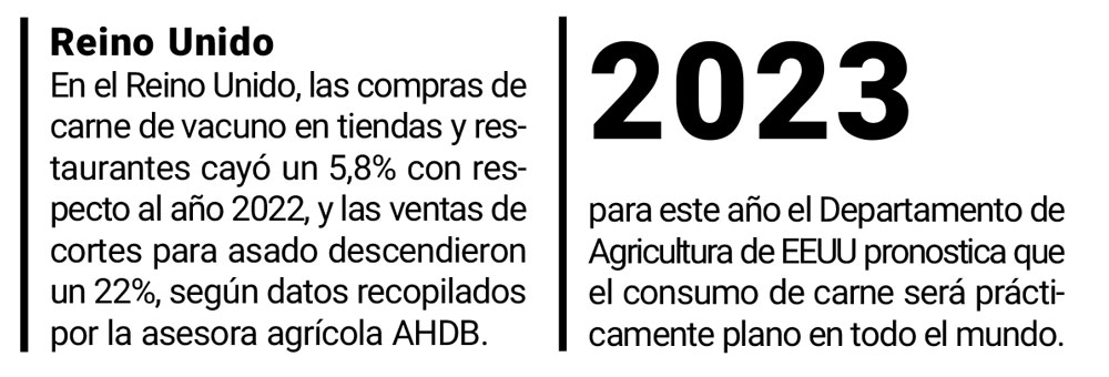 Por ejemplo, en Brasil, el consumo iba camino de alcanzar un mínimo histórico en 2022. Según datos de NielsenIQ, los consumidores estadounidenses han reducido sus compras en más de un 4% en el último año, mientras que las ventas de asado y filete de vacuno en el Reino Unido se han desplomado.