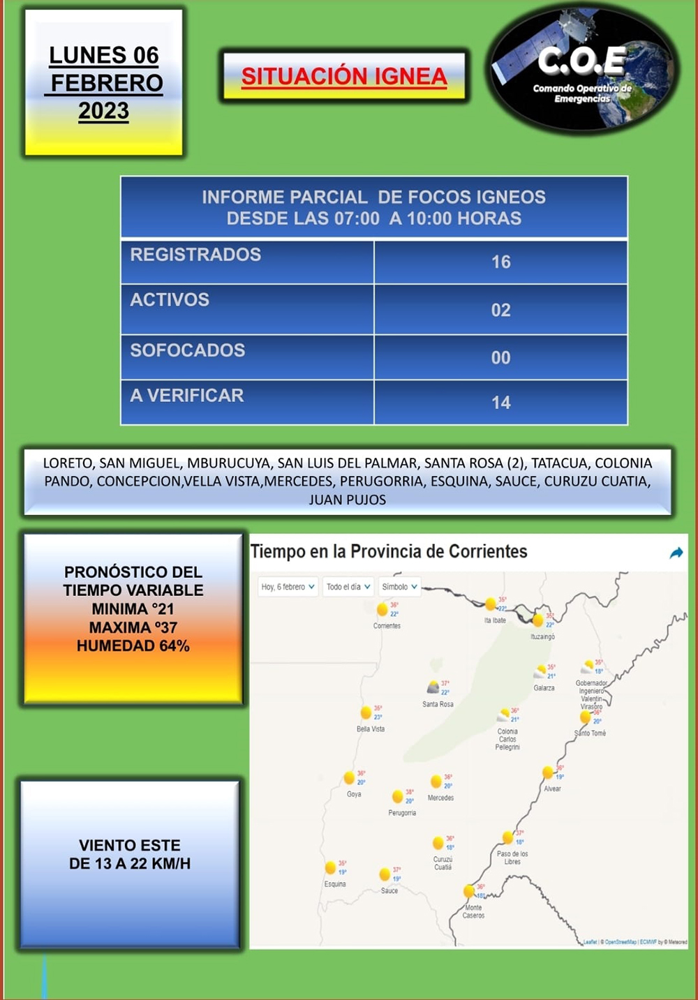 El Comando Operativo de Emergencias (COE) de Corrientes informó este lunes que en las últimas horas se registraron 16 focos de incendio.