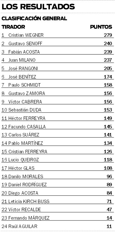 En ese sentido, el triunfo en la divisional Producción quedó en manos de Cristian Wegner, mientras que como escolta culminó Gustavo Senoff, ambos representantes de la Asociación Tiro Federal Misiones, con asiento en Candelaria. Al podio también se subió Fabián Acosta, alumno de la ATD de Eldorado.