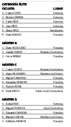 En ese contexto, en la divisional Élite, el triunfo fue del formoseño Carlos Corti, seguido por sus coterráneos Moisés Durán y Pablo Ríos. El mejor misionero fue Diego Báez, representante del equipo Taragüí/Grupo Safac, que terminó quinto.