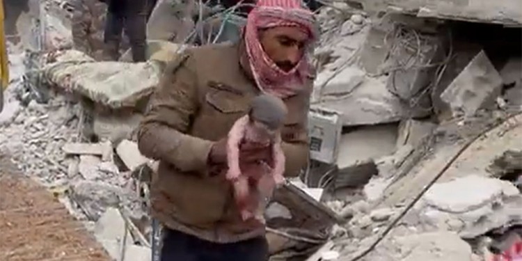 Entre tanta muerte y caos, este miércoles una beba recién nacida, aún unida a su madre por el cordón umbilical, fue rescatada de entre los escombros de un edificio de cuatro plantas que se derrumbó en Jindires, al noroeste de Siria, según informó el sitio