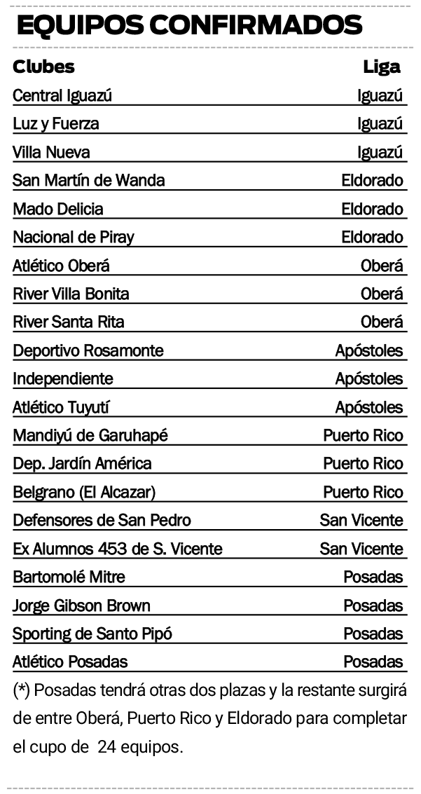 En ese sentido, Rossberg comentó que las Ligas de Apóstoles e Iguazú contarán con una plaza más, es decir que en lugar de dos serán tres los representates. Mientras que Posadas (que tenía 5) tendrá una más y, de la misma manera que entre las Ligas de Eldorado, Oberá y Puerto Rico, deberán definir entre ellas un lugar más para completar el lote de 24.