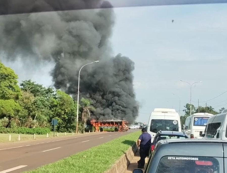 En la calurosa mañana de este viernes, en Puerto Iguazú, un colectivo que prestaba el servicio urbano de pasajeros desde el Hito de las Tres Fronteras hacia el kilómetro 5, se incendió por completo en ese tramo de la ruta 12, pero más allá de los daños materiales no hubo que lamentar víctimas.