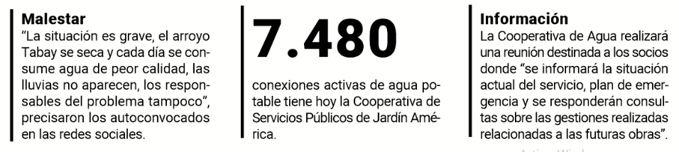 Ante el agravamiento de la situación hídrica del arroyo Tabay, desde el sábado se comenzó la distribución de agua por sectores en Jardín América, de 6 a 18 se suministra a los barrios ubicados al norte de la ruta 12; y de 18 a 6 a los barrios del sur (Centro). “Esto se realiza mediante la operación de válvulas y el efecto no es inmediato. Los barrios de las zonas más altas tienen demoras hasta que llegue el agua a los tanques, por lo que se solicita continuar cumpliendo lo establecido en la Ordenanza Municipal que prohíbe el uso no esencial”, expresaron desde la entidad.