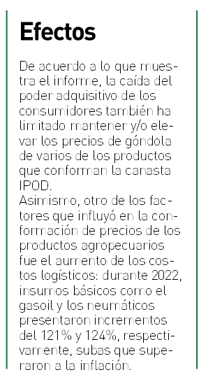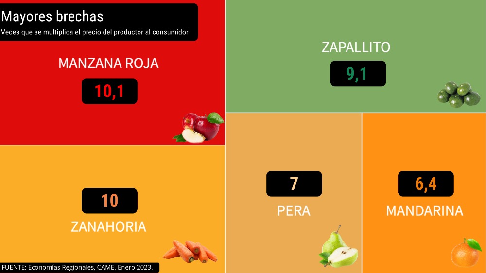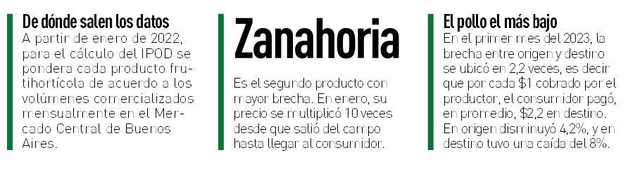 En el caso de los productos frutihortícolas, del campo a la góndola, los precios de las 19 frutas y hortalizas que integran la canasta IPOD se multiplicaron por 4,9 veces en enero, por lo que el consumidor pagó $4,9 por cada $1 que recibió el productor frutihortícola.