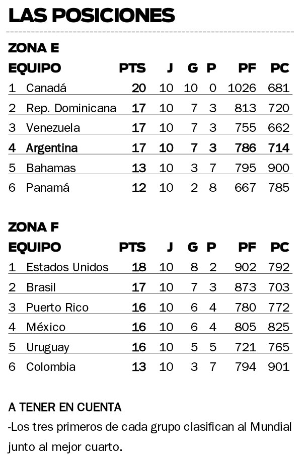 La Albiceleste comenzará a alistarse para el juego de este jueves a las 21.40 frente a Canadá, líder e invicto del grupo, pero además el único ya clasificado hasta el momento a la cita planetaria. El domingo, en tanto, la Selección enfrentará nuevamente en el Polideportivo Islas Malvinas a República Dominicana, desde las 21.10.