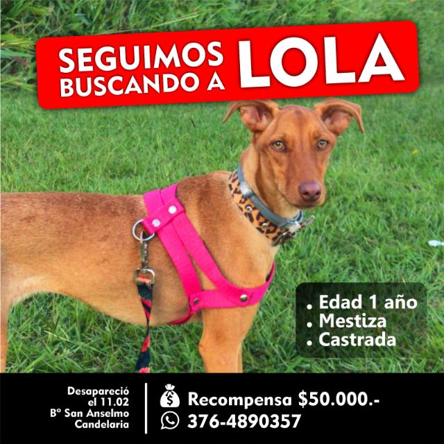 Lola fue vista por última vez el 11 de febrero en el barrio Anselmo de la localidad de Candelaria. Todos aquellos que tengan datos sobre la cachorra o su paradero pueden contactarse al 3764890357 o 3764575970.