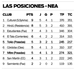 Adelante estará el conjunto correntino, que tiene un partido más y también suma cinco puntos, producto de apenas un triunfo y tres caídas. Su última presentación fue hace diez días y fue con derrota de local ante Sarmiento de Formosa por 73-95.