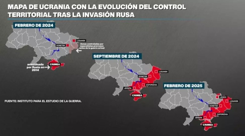 Una evaluación del Instituto para el Estudio de la Guerra del pasado 12 de febrero señalaba la preservación de Rusia de gran parte de los territorios del este y sur de Ucrania, pero también los avances ucranianos,así como su incursión en la región rusa de Kursk, donde Kiev mantiene alrededor del 40 % de los 1.290 kilómetros cuadrados y 100 asentamientos, que tomó, según indicó Moscú.