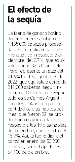 Por la mayor oferta de ganado que provocó la sequía, la faena creció 21,6% interanual durante enero. El Consorcio ABC reportó que se sacrificaron 1,18 millones de vacunos durante el primer mes del año. Esta cifra significa un alza de 211 mil cabezas frente a igual período de 2022, pero una baja de 32.500 si se compara con diciembre. Las condiciones climáticas adversas, que afectaron a gran parte de las áreas de cría y engorde, provocaron “una oferta inusualmente alta de vacas”.