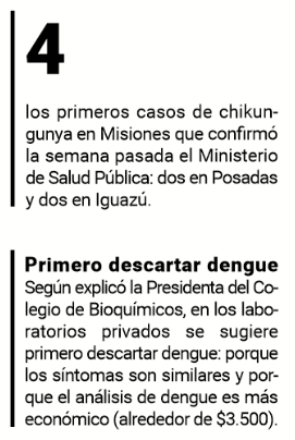 Cabe destacar que los dos primeros casos de chikungunya detectados en la provincia, correspondientes a un padre e hijo de Posadas, fueron detectados a partir de un análisis en un laboratorio privado de la ciudad.