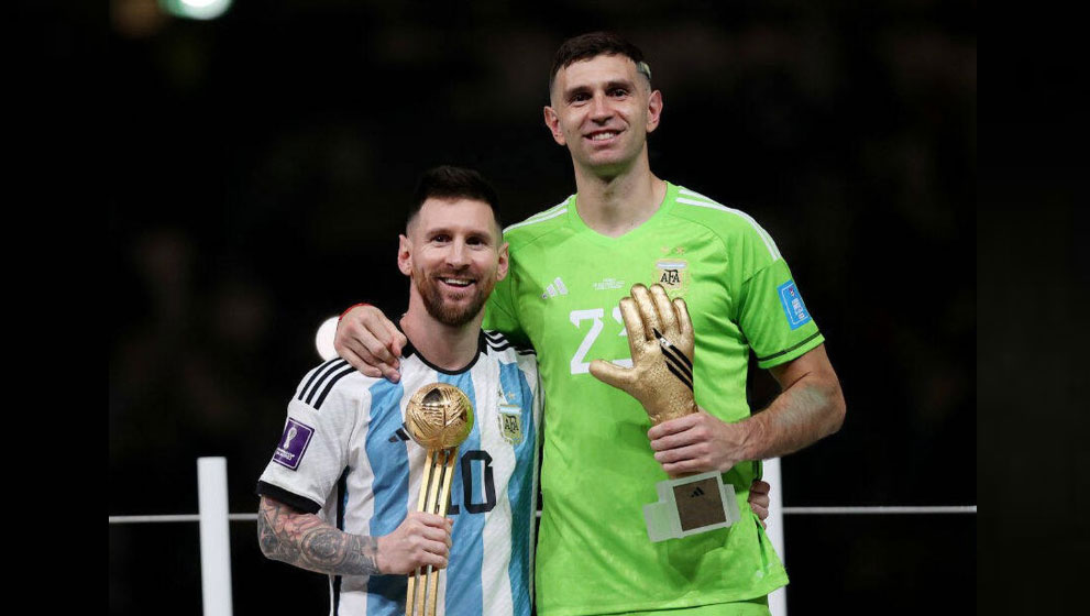 LOS MEJORES. Messi, con su trofeo de MVP del Mundial; el “Dibu” con el suyo como mejor arquero. ¿Se llevan el The Best?