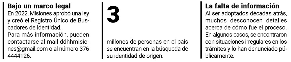 “Pistas sobre mi identidad de origen” se conformó como una herramienta misionera de divulgación de información y como un punto de encuentro para personas que buscan conocer su pasado. A través de relatos en una página de Instagram, comparten casos de gente que busca a sus progenitores y hasta contactar a familiares que aún residan en Misiones.