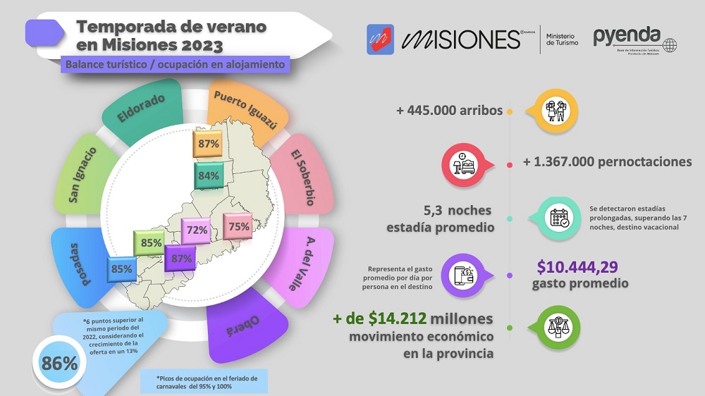 Con este número, Turismo aseguró que hubo un 6% más de movimiento que el mismo periodo estival de 2022, considerando que hay un 13% más de oferta turística disponible en Misiones.