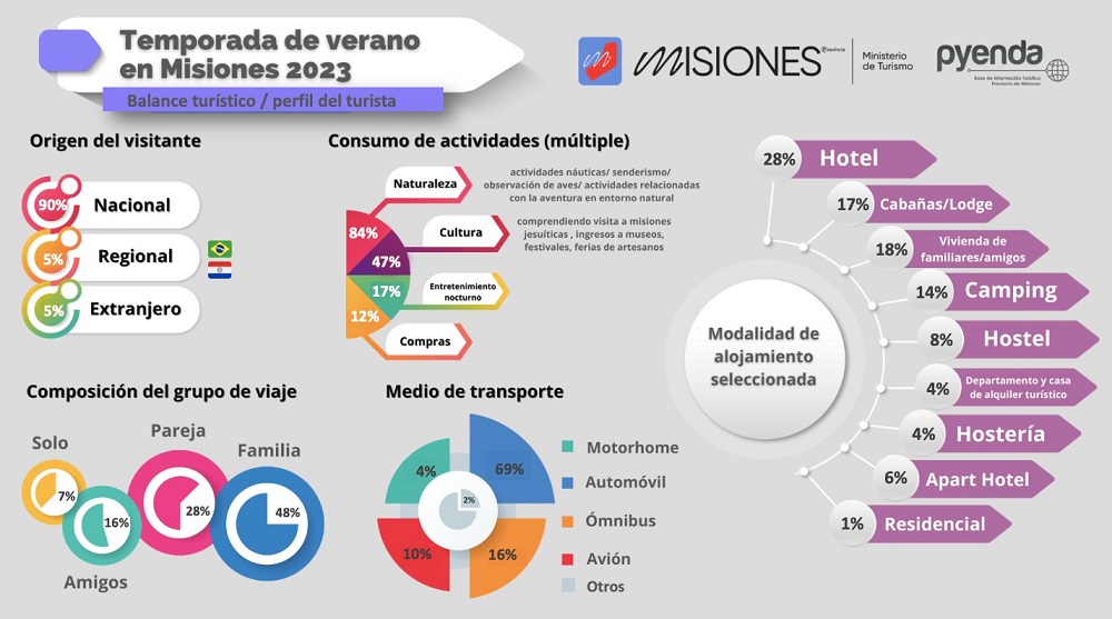 Hubo más de 445.000 arribos que generaron un total de 1.367.000 pernoctaciones, siendo la estadía promedio detectada en la provincia de 5,3 noches (pero se identificaron estadías superiores a las 7 noches, confirmando la elección de los visitantes de Misiones como destino vacacional).