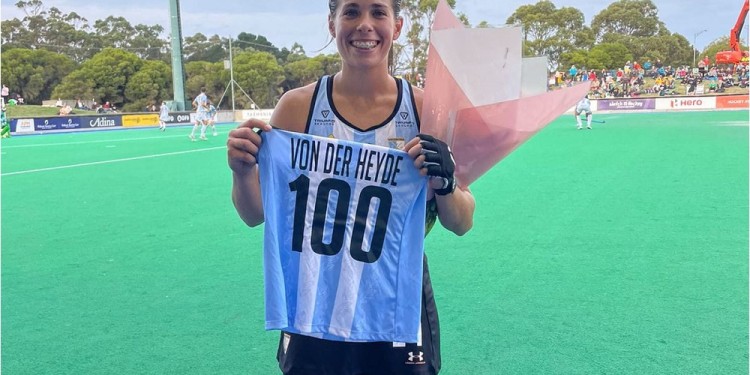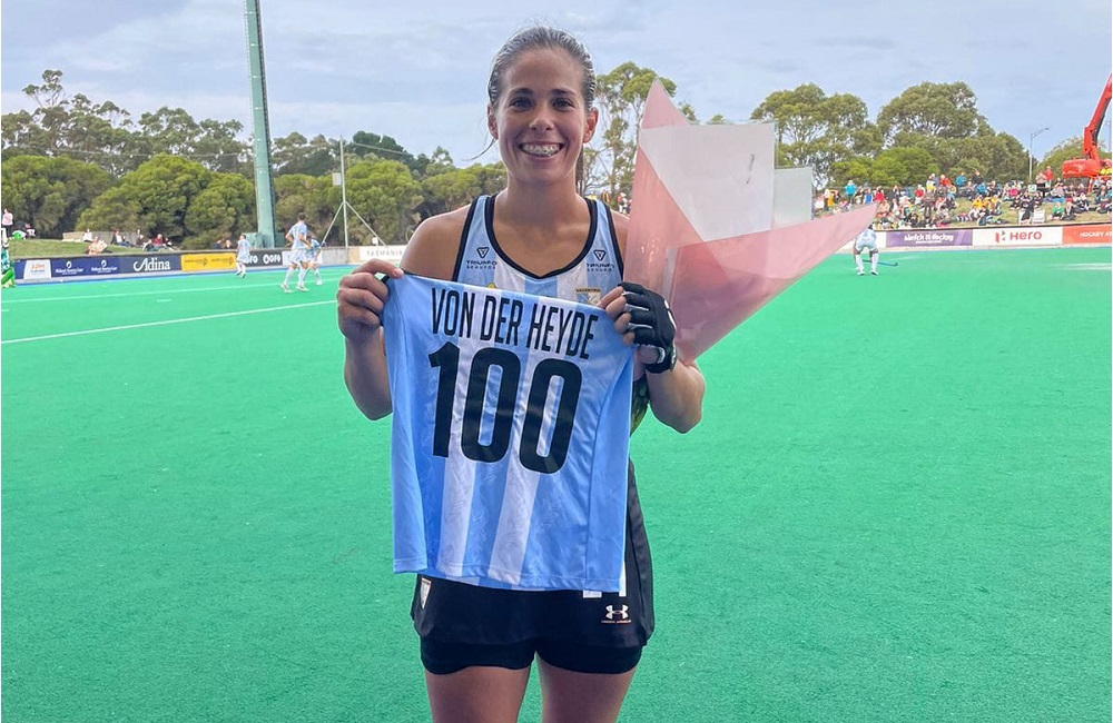 La misionera Lucina Von Der Heyde alcanzó los 100 partidos junto a la selección Argentina de Damas Mayores de hockey, más conocida como Las Leonas y fue agasajada con una camiseta especial y un ramo de flores.