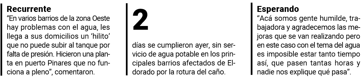 Varios barrios de la zona Oeste de Eldorado se vieron afectados por la falta de agua desde el último domingo como consecuencia de la rotura de un caño que abastece al tanque elevado del Km 8 y que ayer continuaba siendo reparado por los operarios de la CEEL (Cooperativa de Electricidad Eldorado). Hubo numerosos reclamos de vecinos por el faltante del vital líquido, fundamentalmente por la falta de información desde la CEEL sobre qué verdaderamente estaba ocurriendo y cuánto tiempo demoraría en reestablecerse el servicio.