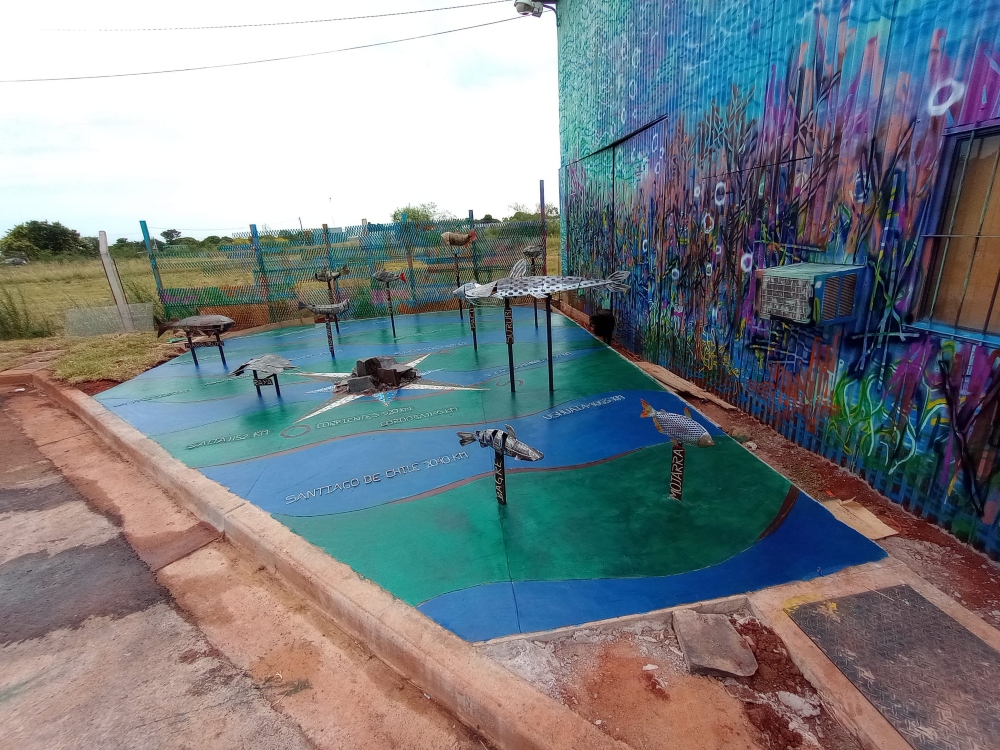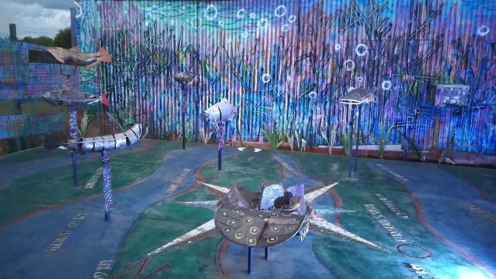 Describió además que los peces de hierro reciclado fueron forjados, la chapa martillada, soldada, “trabajamos también con color que cuando se pintó el mural resaltamos lo colores para que los peces pudieran destacarse en su protagonismo. Todos llevan su nombre para que quienes los visiten sepan de qué pez se trata. Los nombres y las ciudades y sus kilómetros están hechos en barras de acero soldadas e incrustadas en el cemento para que no se oxiden y duren en el tiempo”.