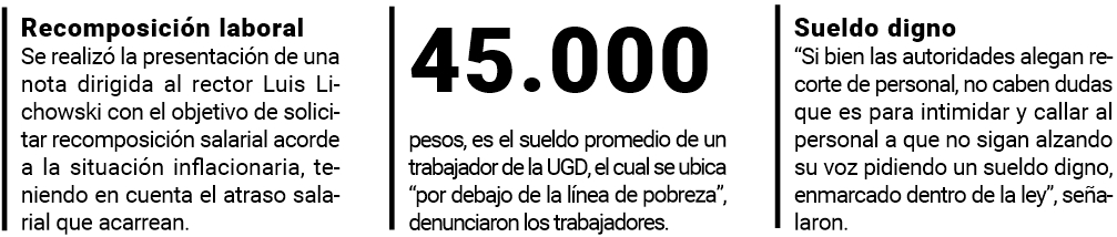 Según detallaron, el pasado 13 de febrero presentaron una nota dirigida al rector Luis Lichowski, solicitando una recomposición salarial “acorde a la situación inflacionaria, teniendo en cuenta el atraso salarial que acarreamos, con sueldos por debajo de la línea de pobreza”.