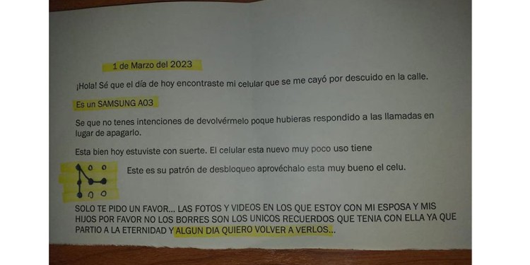 Y es que según explicó en un breve texto que luego imprimió en papel, en ese teléfono tenía fotos de momentos felices junto a su esposa que falleció años atrás.