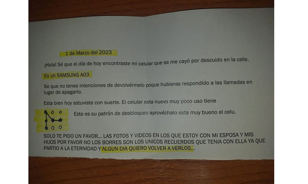 Y es que según explicó en un breve texto que luego imprimió en papel, en ese teléfono tenía fotos de momentos felices junto a su esposa que falleció años atrás.