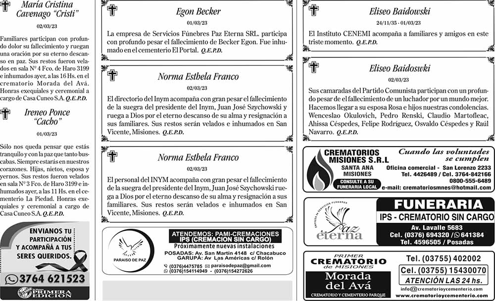 Fúnebres del Viernes 3 de Marzo de 2023