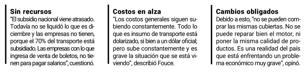 “Los costos generales siguen subiendo constantemente. Hoy por hoy, todo lo que hace al insumo de transporte está dolarizado, si bien a un dólar oficial, pero sube constantemente y es grave para la situación que se está viviendo. Si se tiene en cuenta que es casi un 6% la inflación mensual, en promedio, y no pagan los subsidios, entonces se llega a un 12%, y si se atrasan tres meses entonces es un 18% de atraso en la retracción del subsidio, mientras que el insumo siguió aumentando. Por eso, por ejemplo, no se pueden comprar las mismas cubiertas, no se puede reparar bien el motor, no se puede poner la misma calidad de productos. Es una realidad del país que está enfrentando un problema económico muy grave. Hoy la explotación del transporte no es rentable”, completó.