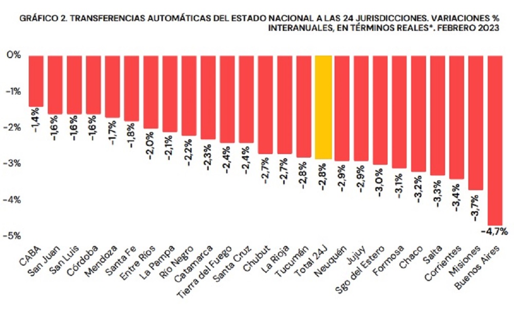 En el mismo informe destacaron que desde agosto de 2022 no había registro de tan baja cantidad de recursos girados por la Nación a todas las provincias, lo cual dejó “en negativo” los porcentajes de los 24 distritos.